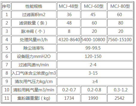 MCJ-48型、60型、80型脈沖袋式集粉器其結(jié)構(gòu)與工作原理:它由上、中、下箱體、排灰系統(tǒng)及噴吹、清粉系統(tǒng)五部分組成。上箱體包括可掀起 的蓋板和出風(fēng)口;中箱體內(nèi)有多孔板、濾袋、骨架及文氏管;下箱體由料斗、支架、進(jìn)風(fēng)口檢查門組成;下料系統(tǒng)由電機(jī)、減速機(jī)及刮板組成,噴吹管和氣包。